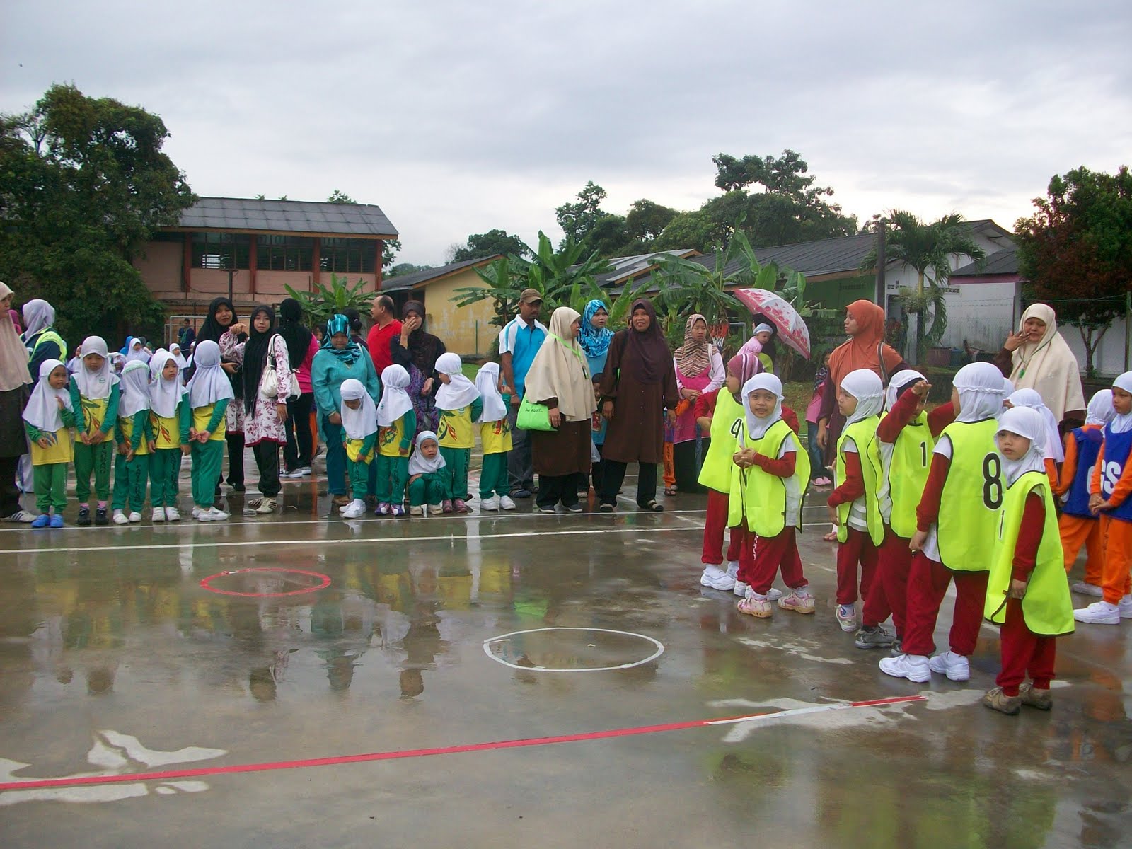 Gelanggang basah. Hujan lebat sejak jam 5 pagi.