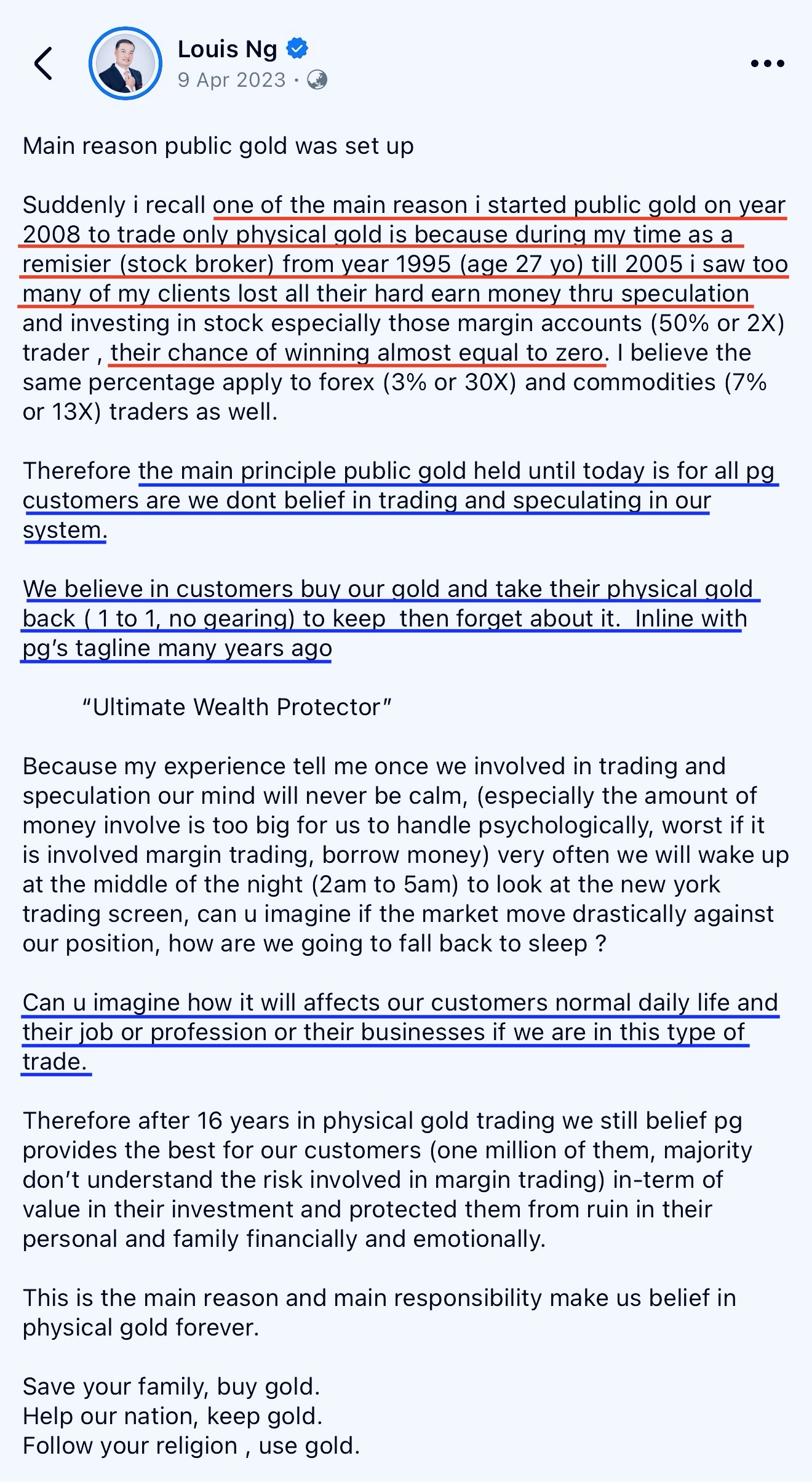 Therefore after 16 years in physical gold trading we still belief Public Gold provides the best for our customers (one million of them, majority don’t understand the risk involved in margin trading) in-term of value in their investment and protected them from ruin in their personal and family financially and emotionally.