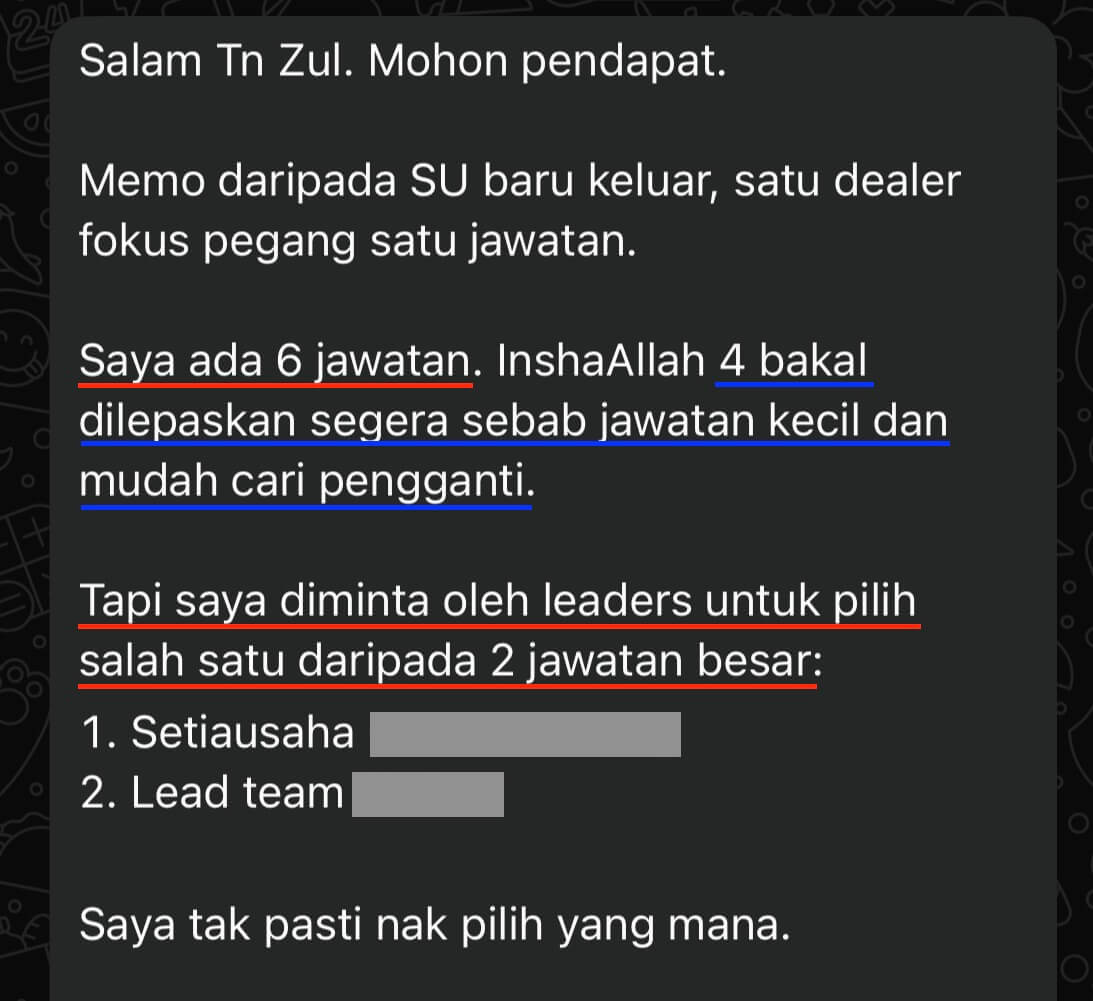 Bila disuruh lepas semua jawatan lain (kecuali satu), mereka berbelah bagi... Kalau boleh nak terus pegang beberapa jawatan - supaya dapat terus menyumbang kebaikan!...