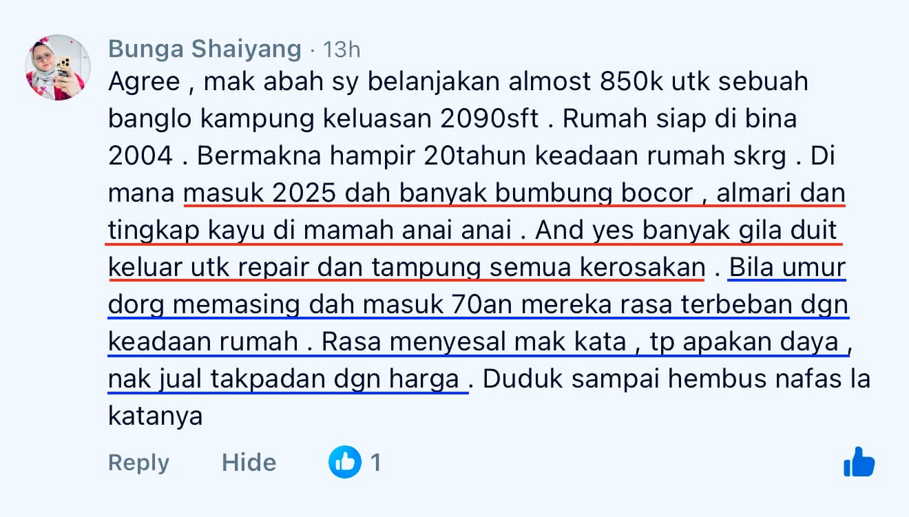 👉 Belilah rumah dilokasi yang bagus, yang dekat dengan banyak kemudahan - macam rumah dalam township. Bukan rumah di ceruk kampung. Kalau rumah tu tak laku, nilai tanahnya makin mahal. Orang sanggup beli sebab lokasi tanah.