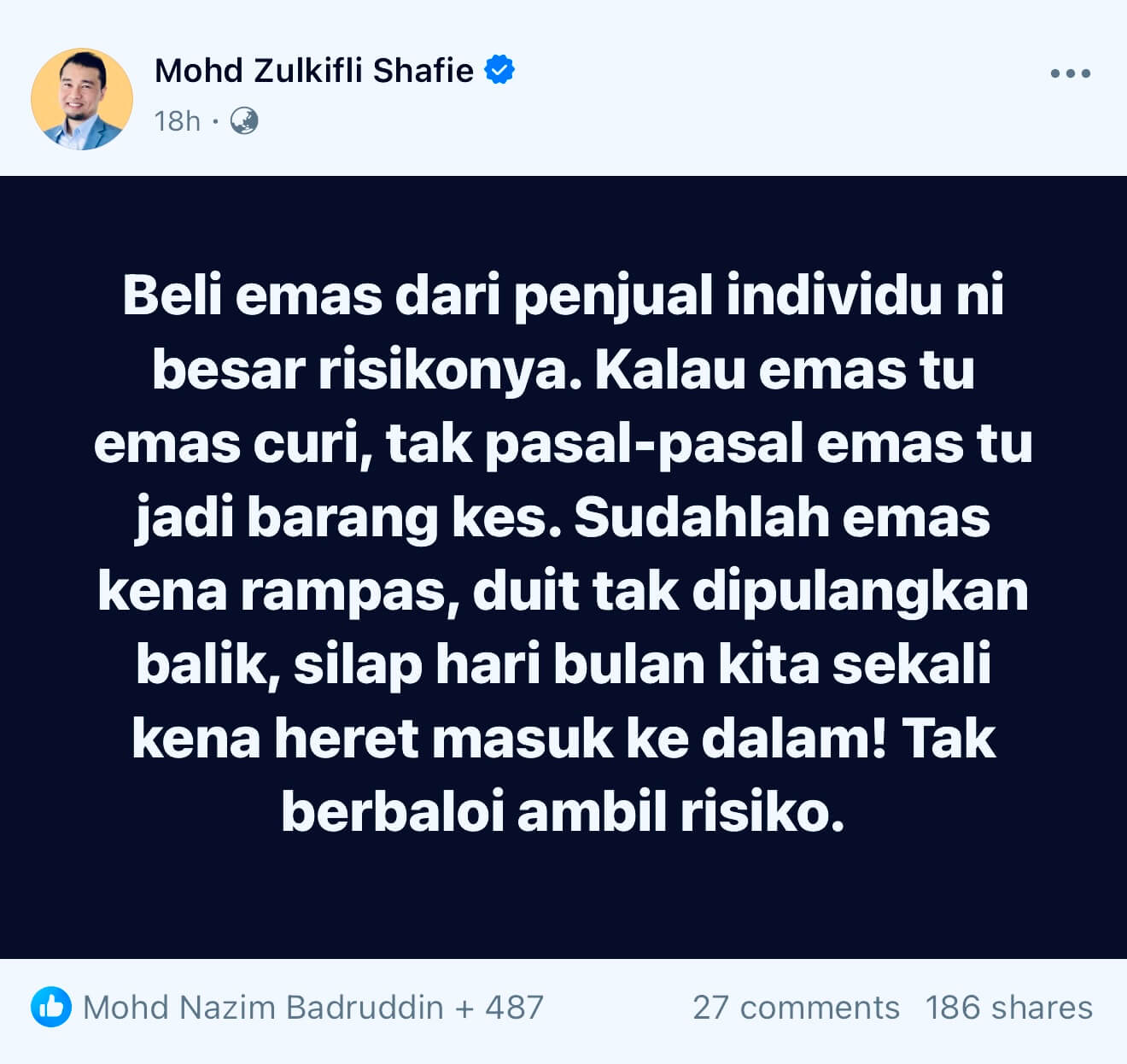 Itu respond saya bila ramai yang triggered dengan posting FB Tuan Azizi Ali pasal risiko beli emas "pre-loved". Tapi saya yakin, kebanyakannya ialah individu yang jual emas pre-loved.