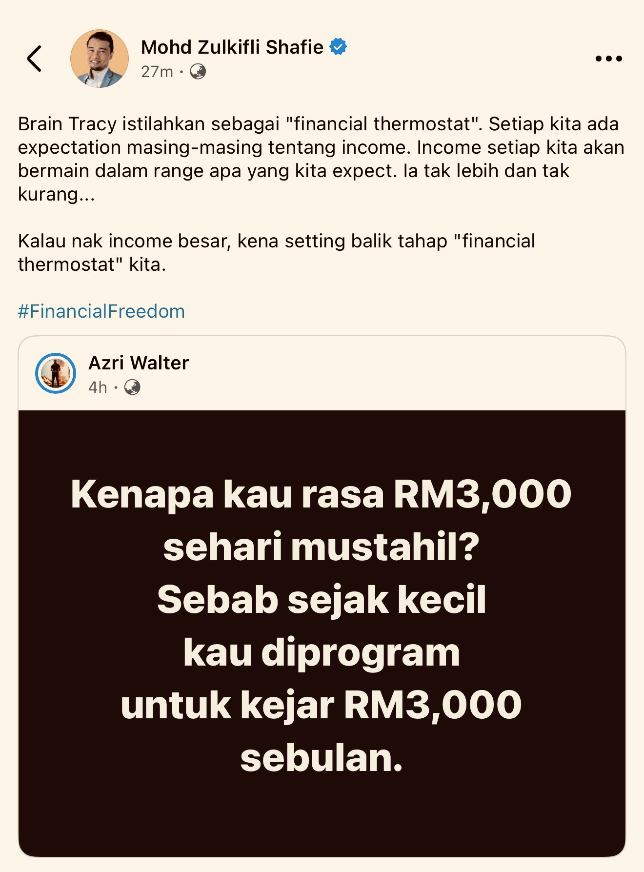 "Kenapa kau rasa RM3,000 sehari mustahil?... Sebab sejak kecil kau diprogram untuk kejar RM3,000 sebulan." - Azri Walter, 26 Disember 2025