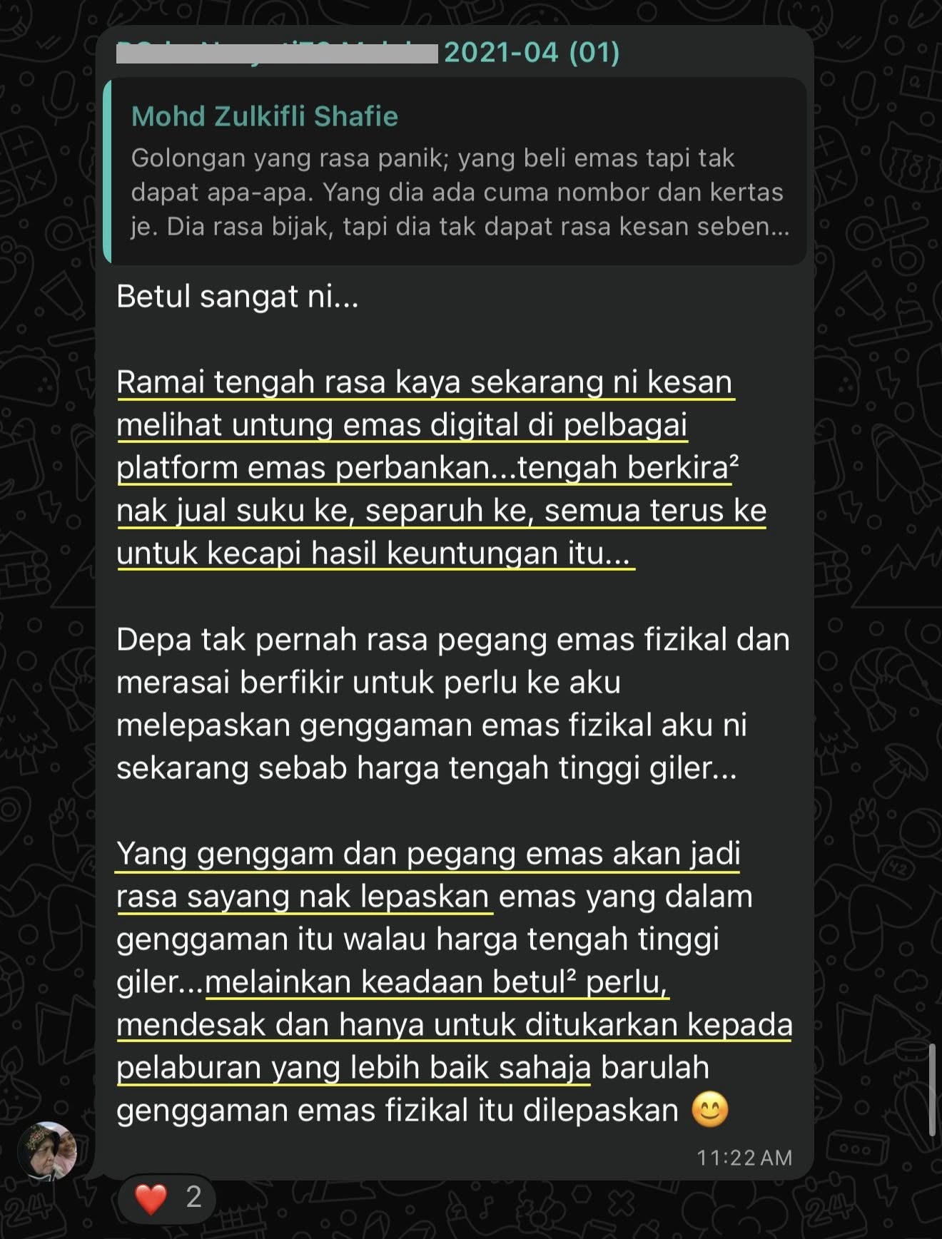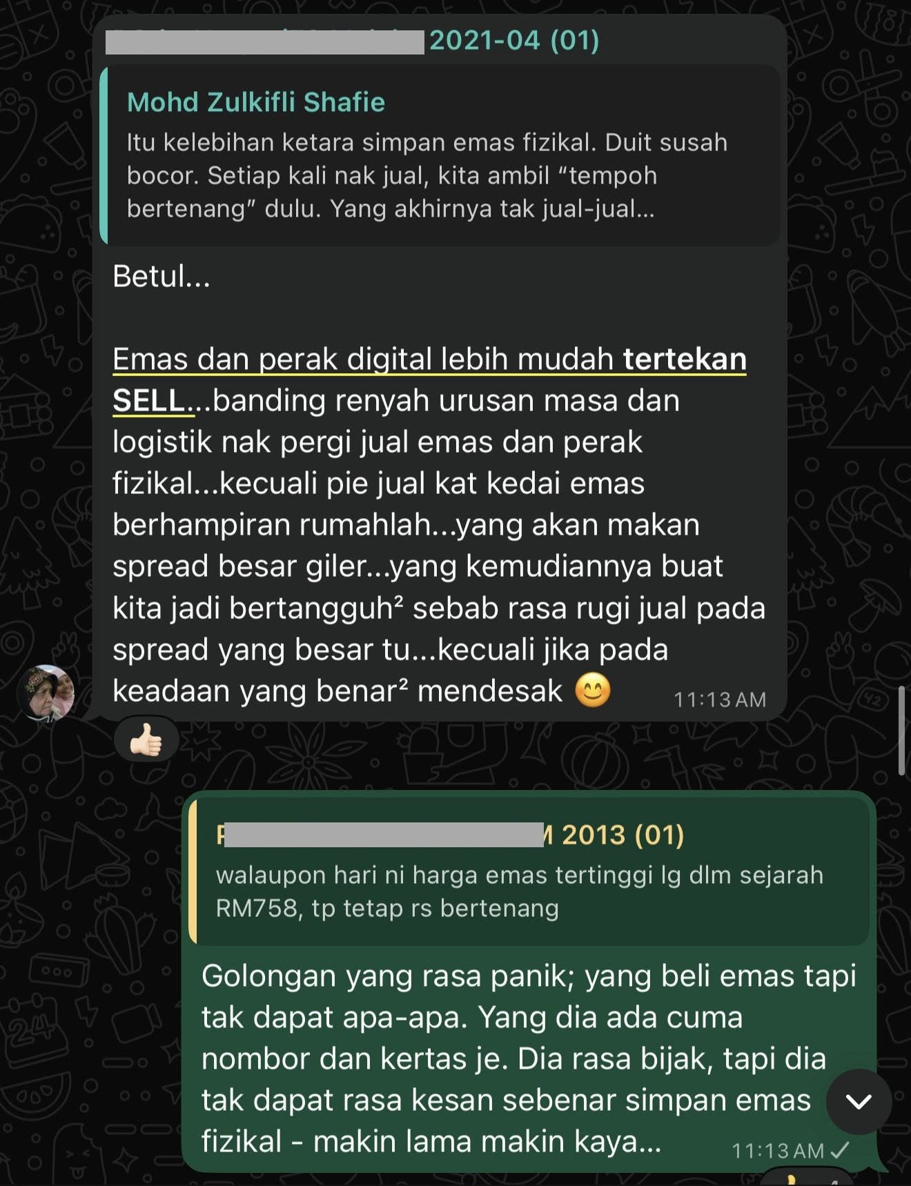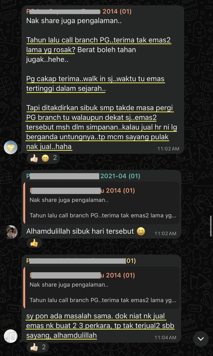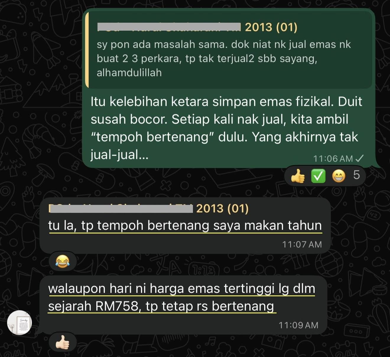 Perbualan dalam wasap group penyimpan emas di bawah bimbingan saya. Sebahagian mereka dah lebih 10 tahun menyimpan emas. Mereka dah lama 'kaya dengan emas'.